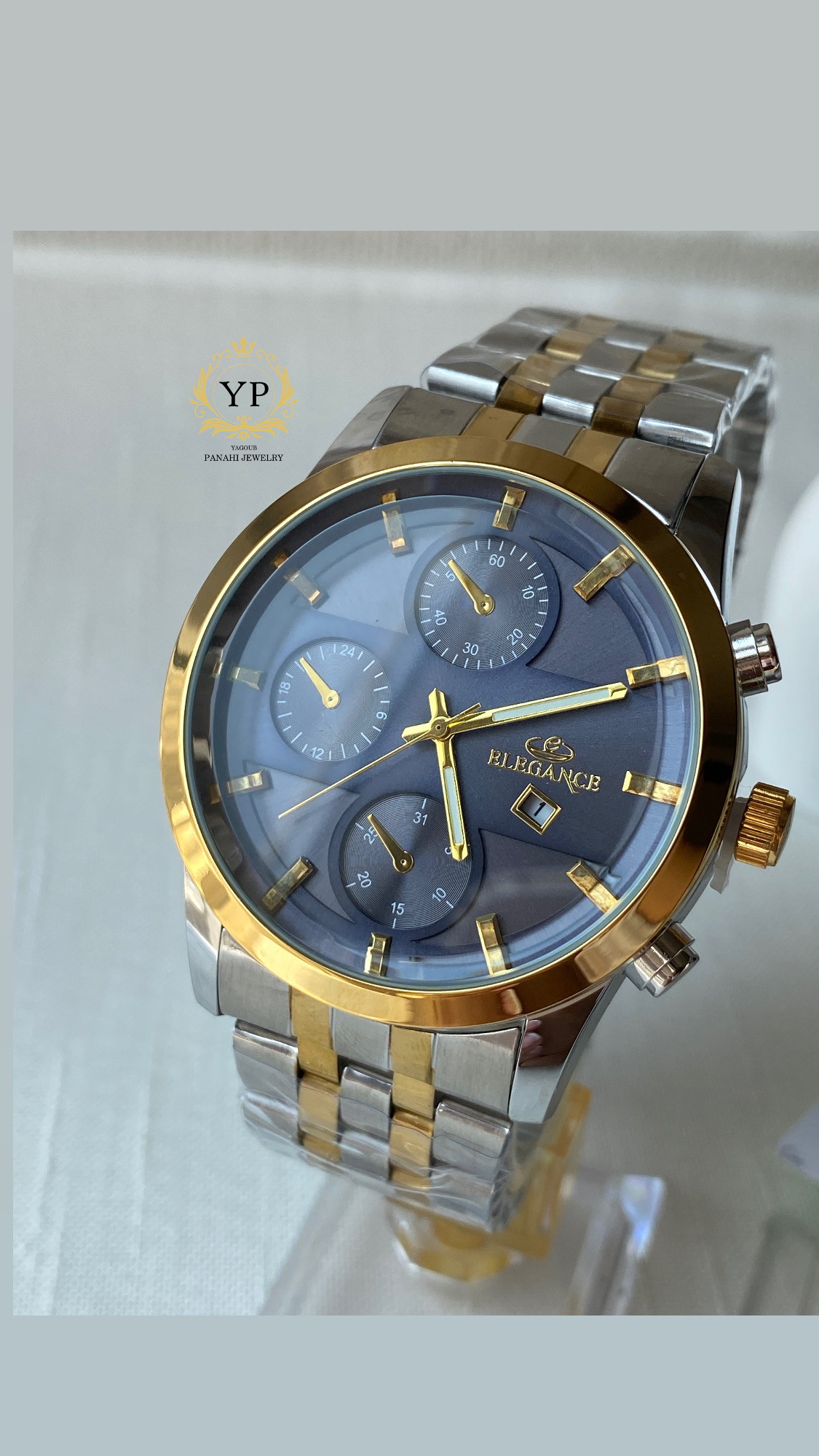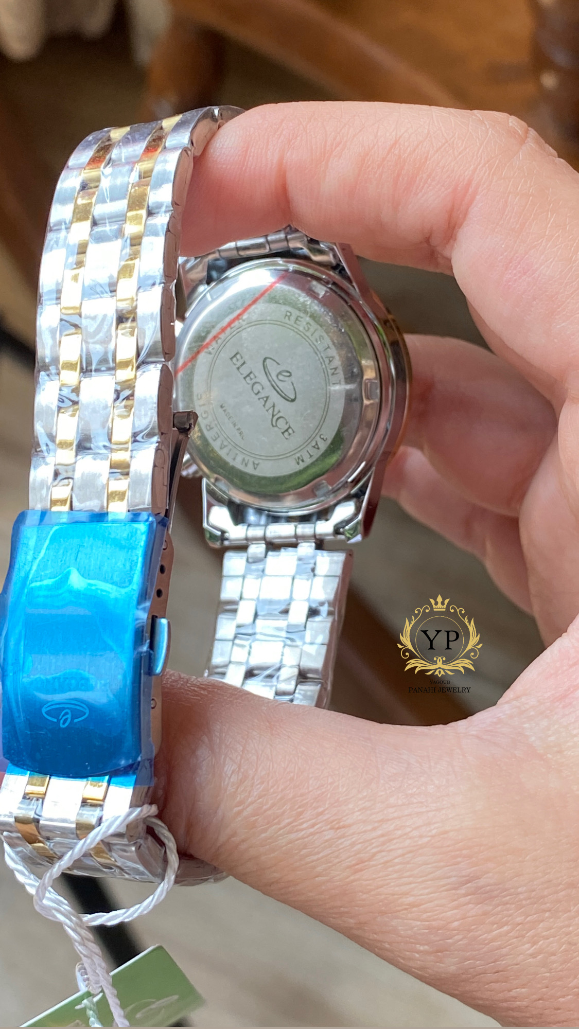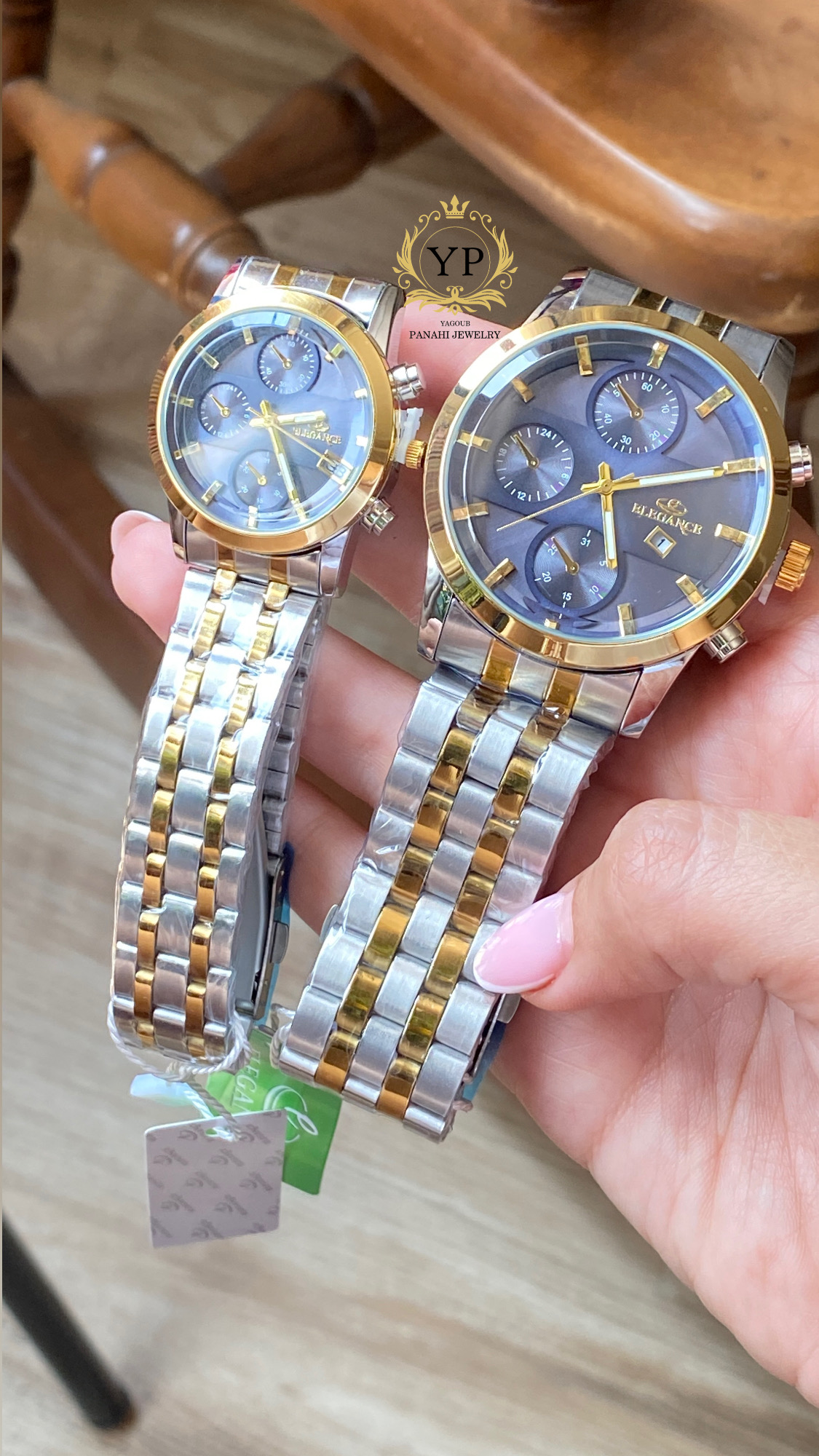 ست ساعت زنانه/مردانه برند الگانس بند دورنگ حک برند پشت صفحه و روی قفل رنگ ثابت بند استیل ضدآب درحد شستشوی دست بدلیجات_عمده تبریز