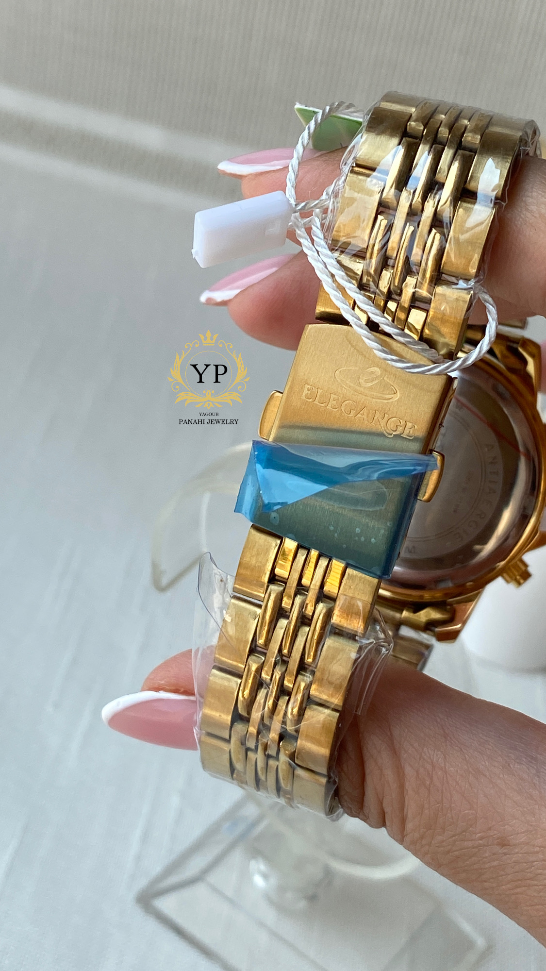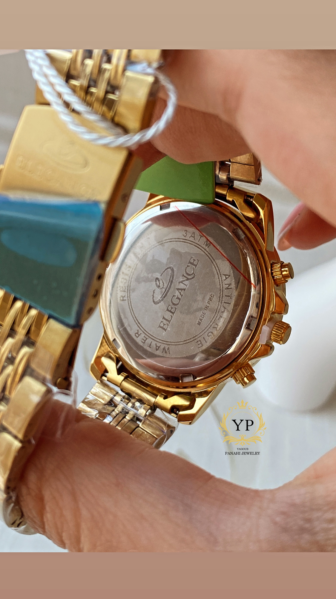 ست ساعت زنانه/مردانه برند الگانس بند تک رنگ طلایی حک برند پشت صفحه و روی قفل رنگ ثابت بند استیل ضدآب درحد شستشوی دست بدلیجات_عمده تبریز